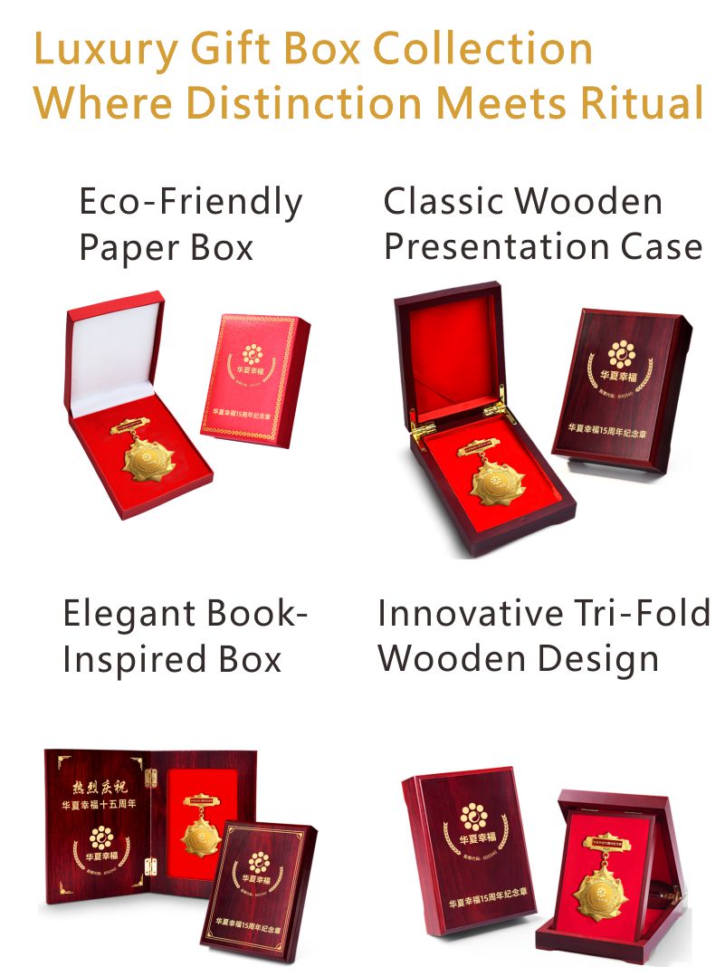 Packaging: Elegant paper/wooden/book-style/tri-fold gift boxes for a ceremonial presentation.